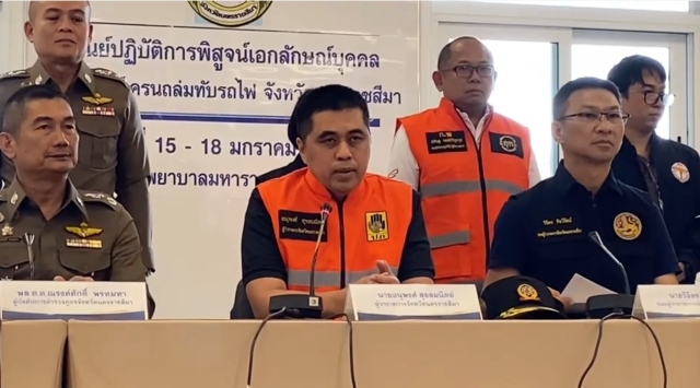 วันที่ 18 มกราคม 2569 เวลา 11.30 น. ที่โรงพยาบาลมหาราชนครราชสีมา นายอนุพงศ์ สุขสมนิตย์ ผู้ว่าราชการจังหวัดนครราชสีมา พร้อมด้วย นายวิจิตร กิจวิรัตน์ รองผู้ว่าราชการจังหวัดนครราชสีมา พล.ต.ต.ณรงค์ศักดิ์ พรหมทา ผู้บังคับการตำรวจภูธรจังหวัดนครราชสีมา พล.ต.ต.หญิง พิฐขญาณ์ จิรัญญ์โรจน์ ผู้บังคับการศูนย์พิสูจน์หลักฐาน 3 สำนักงานพิสูจน์หลักฐานตำรวจ นายแพทย์ชยพล สุขโต รองนายแพทย์สาธารณสุขจังหวัดนครราชสีมา นายแพทย์ทวีชัย วิษณุโยธิน ผู้อำนวยการโรงพยาบาลมหาราชนครราชสีมา และ นายกฤษฎิ์ พูนเกษม หัวหน้าสำนักงานป้องกันและบรรเทาสาธารณภัยจังหวัดนครราชสีมา ได้ร่วมกันแถลงปิดศูนย์ปฏิบัติการพิสูจน์เอกลักษณ์บุคคล เหตุการณ์เครนก่อสร้างทางรถไฟความเร็วสูงถล่มทับขบวนรถไฟในพื้นที่อำเภอสีคิ้ว จังหวัดนครราชสีมา หลังดำเนินการตรวจพิสูจน์อัตลักษณ์ และประสานช่วยเหลือผู้ประสบเหตุจนมีความคืบหน้าอย่างเป็นรูปธรรม