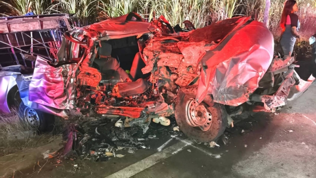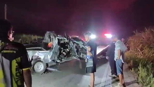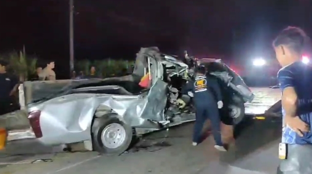 ในที่เกิดเหตุพบรถกระบะ 4 ประตู สภาพด้านหน้าพังยับเยินชนประสานงากับรถกระบะอีกคัน ซึ่งใช้บรรทุกแรงงานต่างด้าว สภาพรถได้รับความเสียหายอย่างหนัก ภายในรถพบผู้โดยสารทั้งบาดเจ็บและเสียชีวิตติดอยู่หลายราย