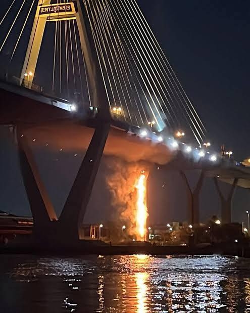 จากกรณีเหตุไฟไหม้จากโคนเสาตอม่อสะพานภูมิพล 2 ฝั่งปู่เจ้าสมิงพราย ต.บางหญ้าแพรก อ.พระประแดง จ.สมุทรปราการ เมื่อช่วงค่ำวันที่ 15 มกราคม 69 ที่ผ่านมา ก่อนที่ไฟจะลุกลามติดท่อยางระบายน้ำของโครงสร้างสะพาน จนทำให้มีแสงเพลิงรุนแรงและไฟลุกลามขึ้นที่สูงติดใต้คานสะพานด้านบน ซึ่งมีความสูงกว่า 50 เมตร เจ้าหน้าที่ต้องประสานขอรถดับเพลิงแบบรถกระเช้ายกสูงขึ้นไปฉีดน้ำด้านบน เพื่อดับเพลิงในครั้งนี้ โดยใช้เวลากว่า 1 ชั่วโมง เพลิงจึงสงบ