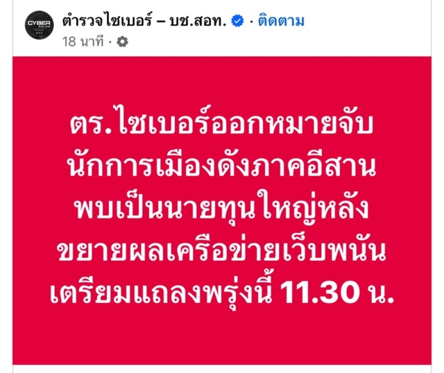 ทำเอาชาวเน็ตปูเสื่อรอ หลังจากเพจทางการของ ตำรวจไซเบอร์ – บช.สอท. โพสต์ข้อความระบุว่า "ตร.ไซเบอร์ ออกหมายจับนักการเมืองดังภาคอีสาน พบเป็นนายทุนใหญ่หลังขยายผลเครือข่ายเว็บพนัน เตรียมแถลงพรุ่งนี้ 11.30 น."