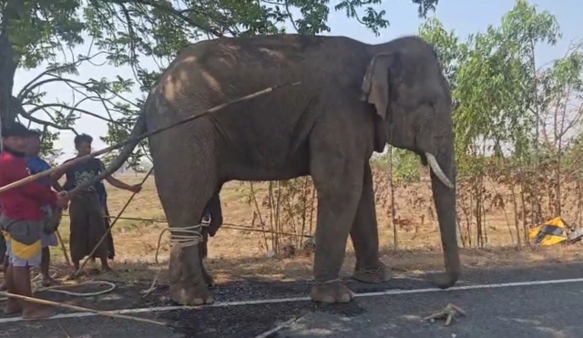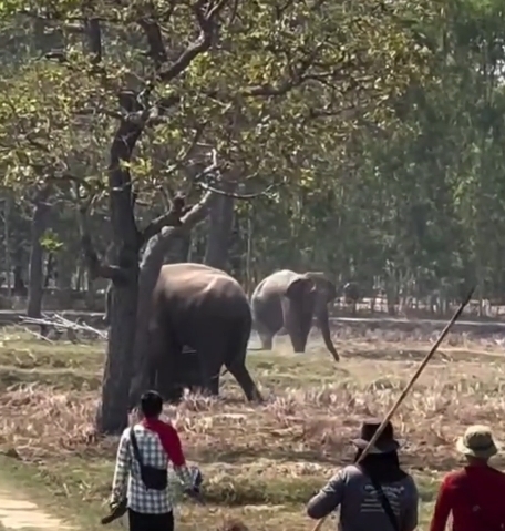 เมื่อเจ้าหน้าที่ไปถึงพบช้างกำลังทำลายรถยนต์ 2 คัน ได้รับความเสียหายและยังพยายามไล่ทำร้ายชาวบ้านที่มายืนดูอีกหลายคน