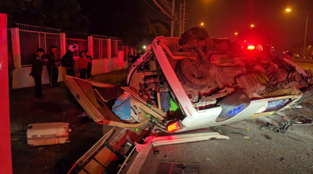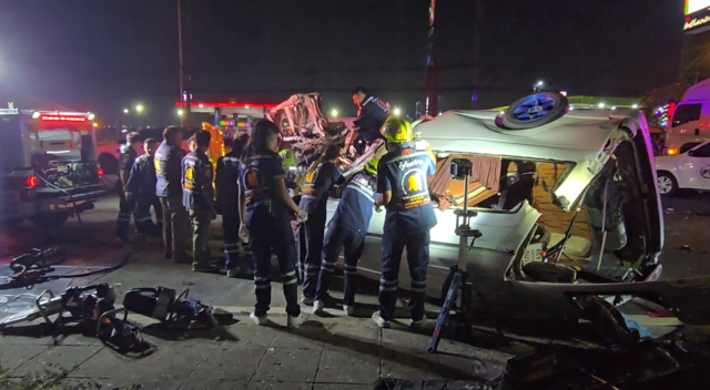 ในที่เกิดเหตุพบรถตู้โดยสารชนกันจำนวน 2 คัน รวมทั้งรถยนต์อเนกประสงค์ยี่ห้อ FordEverest สีขาว ทะเบียนชลบุรี ได้รับความเสียหายบริเวณด้านหน้าฝั่งซ้าย จอดอยู่เลนขวาสุด ใต้ท้องรถพบร่างผู้เสียชีวิต 1 ราย เป็นชาย ส่วนเลนกลางพบรถตู้ Toyota สีขาว ทะเบียนกรุงเทพมหานคร และมีรถตู้อีกคันพลิกคว่ำอยู่ในเลนซ้ายสุดในสภาพพังยับเยิน ทะเบียนกรุงเทพมหานคร พลิกคว่ำอยู่ในสภาพพังยับเยิน มีผู้ได้รับบาดเจ็บติดอยู่ภายในรถตู้จำนวนหลายคน เจ้าหน้าที่กู้ภัยเร่งใช้อุปกรณ์ตัดถ่างนำผู้ได้รับบาดเจ็บออกมาจากรถตู้ ก่อนช่วยกันปฐมพยาบาลเบื้องต้น นำส่งโรงพยาบาล รวมผู้ได้รับบาดเจ็บทั้งสิ้น 13 ราย เสียชีวิต 3 ราย เป็นชาย 2 ราย หญิง 1 ราย