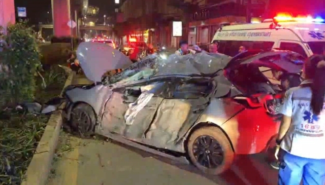 ที่เกิดเหตุอยู่บนถนน 3 เลนฝั่งขาออก มุ่งหน้าบางบัว บริเวณช่องจราจรขวาสุด พบรถเก๋งยี่ห้อฮอนด้า ซิตี้ สีเทา สภาพหน้ารถกันชนหลุด หลังคาและตัวรถฝั่งซ้ายพังยับเยิน ส่วนคนขับขี่ได้รับบาดเจ็บเลือดไหลออกจมูกอาการสาหัสหมดสติ จากนั้นทีมกู้ภัยฯจึงทำการช่วยเหลือปั้มหัวใจนานกว่า 30 นาทีแต่ไม่เป็นผลเสียชีวิตในเวลาต่อมา