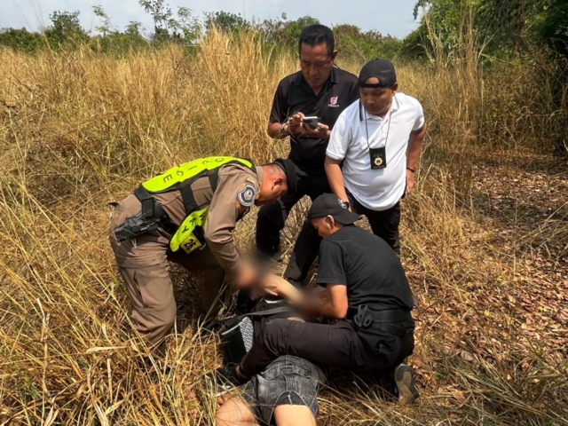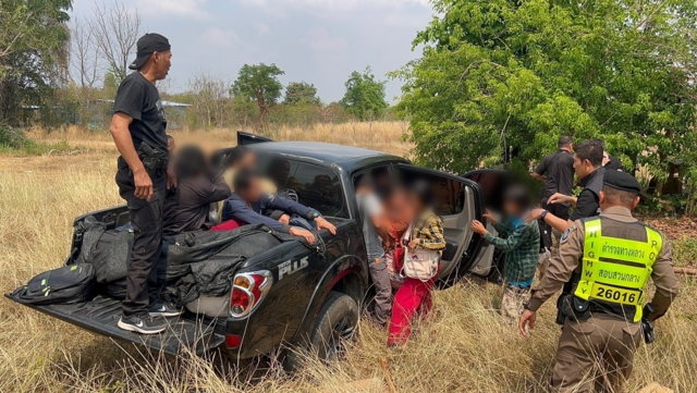 จึงได้นำรถยนต์สายตรวจ ออกตรวจทางหลวงหมายเลข 323 จนกระทั่งเวลาประมาณ 12.20 น. ได้พบรถยนต์ต้องสงสัย วิ่งมาบน ทล.323 เมื่อมาถึงช่วง ทล.323 กม.100 ต.ลุ่มสุ่ม อ.ไทรโยค จ.กาญจนบุรี ลักษณะบรรทุกหนักและใช้ความเร็วสูง เจ้าหน้าที่ตำรวจจึงได้ติดตามจนมาถึง ทล.323 กม.71-72 พร้อมทั้งได้สั่งให้ผู้ขับขี่หยุดรถเพื่อทำการตรวจสอบ พบผู้ขับขี่ ชื่อนายต้นรักฯ สัญชาติ เมียนมา (ทราบชื่อภายหลัง) ภายในห้องโดยสาร พบบุคคลต่างด้าว นั่งอัดอยู่ภายในห้องโดยสาร จำนวน 14 ราย และนอนอยู่ภายในกระบะท้าย อีกจำนวน 3 ราย โดยเอากระเป้าสัมภาระวางทับตัว และมีผ้าตาข่ายสีดำคลุมเพื่อปิดบังสายตา