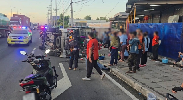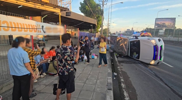 ในที่เกิดเหตุพบรถยนต์กระบะตอนเดียวมีหลังคา บรรทุกรับส่งคนงาน ทะเบียนชลบุรี พลิกคว่ำตะแคงข้างอยู่บนถนนโดยมีผู้ได้รับบาดเจ็บนอนกระจัดกระจายเกลื่อนพื้นถนน โดยพลเมืองดีช่วยกันลำเลียงคนเจ็บเข้าข้างทาง เพื่อเปิดการจราจรและอำนวยความสะดวกแก่ผู้ไม่ได้รับบาดเจ็บ โดยพบว่ามีผู้โดยสารมากับรถประมาณ 20 ราย ได้รับบาดเจ็บประมาณ 15 คน เป็นแรงงานชาวเมียนมาทั้งหมดโดยแต่ละคนมีอาการบาดเจ็บ ศีรษะแตก แขนขาถลอก ตามร่างกายปวดบวม เจ้าหน้าที่กู้ภัยถึงรีบทำการปฐมพยาบาลเบื้องต้น ก่อนลำเลียงนำส่งโรงพยาบาล