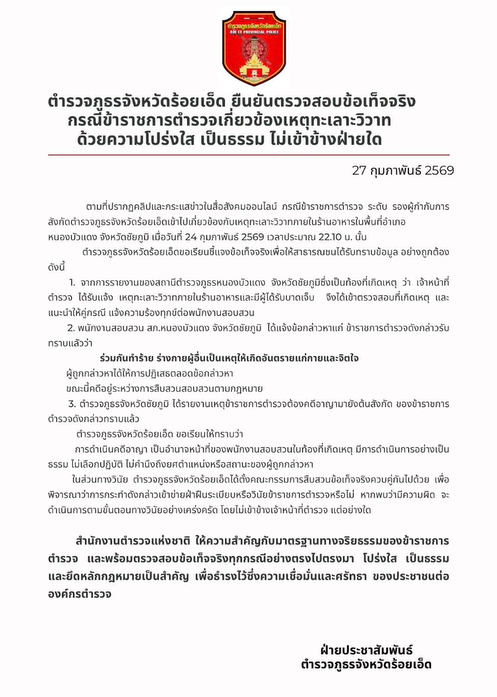 เมื่อเวลา 08.30 น. (28 ก.พ. 2569) พล.ต.ท.สันติชัย นิรามัย ผบช.ภ.4 ให้สัมภาษณ์สื่อมวลชน กรณีคลิปที่ถูกเผยแพร่ในสื่อสังคมออนไลน์ กรณีข้าราชการตำรวจระดับรองผู้กำกับการสังกัดตำรวจภูธรจังหวัดร้อยเอ็ด เข้าไปเกี่ยวข้องกับเหตุทะเลาะวิวาทภายในร้านอาหารในพื้นที่ อ.หนองบัวแดง จ.ชัยภูมิ เมื่อวันที่ 24 ก.พ. 2569 เวลาประมาณ 22.10 น. ว่า ได้สั่งการให้ผู้บังคับการตำรวจภูธรจังหวัดร้อยเอ็ด ทำการตรวจสอบกรณีดังกล่าวแล้วว่า เหตุทะเลาะวิวาทที่มีภาพนายตำรวจเผยแพร่ในสื่อสังคมออนไลน์นั้น เป็นนายตำรวจสังกัดตำรวจภูธรจังหวัดร้อยเอ็ดจริงหรือไม่ และถ้ามีตำรวจในสังกัดฯเกี่ยวข้องจริง ขอให้มีการตั้งคณะกรรมการขึ้นมาตรวจสอบข้อเท็จจริง และให้ความเป็นธรรมกับทุกฝ่ายด้วย