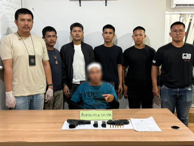 จากการเข้าตรวจค้นห้องพักโดยความยินยอมของผู้ต้องหา เจ้าหน้าที่พบของกลางซุกซ่อนอยู่ในเกะหัวนอนด้านซ้าย ประกอบด้วย: ปืนกึ่งอัตโนมัติ SIG SAUER ขนาด 9 มม. จำนวน 1 กระบอก,ซองกระสุนปืน(Magazine) จำนวน 2 ซอง,เครื่องกระสุนปืนขนาด 9 มม. จำนวน 6 นัด,ซองพกปืน จำนวน 1 อัน