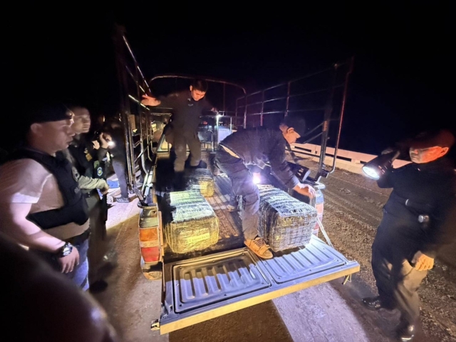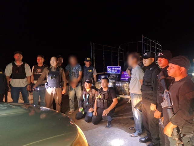กระทั่ง เจ้าหน้าที่ชุดจับกุมได้ทำการดักซุ่ม เฝ้าสังเกตุที่บริเวณริมฝั่งแม่น้ำโขงในพื้นที่ดังกล่าว พบมีเรือมาจอดเทียบฝั่งพร้อมทั้งโยนห่อพัสดุจำนวนหลายห่อลงจากเรือแล้วขี่ข้ามฟากไปทางฝั่งลาว จากนั้นได้มีชาย จำนวน 2 คน แบกห่อพัสดุขึ้นบนรถยนต์และขับขี่ออกไป เจ้าหน้าที่ชุดจับกุมได้ส่งสัญญาณให้อีกชุดที่ทำการดักซุ่มอยู่ระหว่างทางให้เตรียมตัว ทั้งแจ้งตำหนิรถยนต์ให้ทราบ เมื่อถึงบริเวณถนนหมายเลข 212 สาย (บึงกาฬ-บุ่งคล้า) เจ้าหน้าที่ได้แสดงตัวแจ้งให้รถยนต์คันดังกล่าวหยุดรถ แต่ผู้ขับขี่รถคันดังกล่าวไม่ยอมหยุด ทั้งยังเร่งเครื่องยนต์เพื่อหลบหนี เจ้าหน้าที่จึงได้ไล่ติดตาม และได้สกัดจับผู้ต้องได้ที่บริเวณสะพานแห่งหนึ่ง ถนน สาย (พรชัย-เซกา) พื้นที่ ต.ชัยพร อ.เมืองบึงกาฬ จว.บึงกาฬ ได้ทำการจับกุมผู้ต้องหา จำนวน 2 คน ดังนี้1.นายณัทกฤชฯ อายุ 53 ปี คนขับรถ 2.นายประสงค์ฯ อายุ 59 ปี ผู้โดยสารคนนั่งข้างคนขับรถ พร้อมด้วยของกลางดังกล่าวข้างต้น
