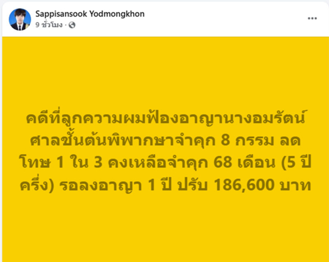ยังเขียนคอมเมนต์เพิ่มเติมว่า คาดว่าลูกความจะอุทธรณ์ต่อแน่นอน เพราะฟ้องจริง ๆ มัน 44 กรรม ศาลลงโทษ 8 กรรม ต้องเอาผิดให้ถึงที่สุด ไม่ให้เป็นเยี่ยงอย่างในสังคม
