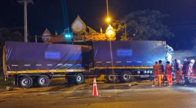 เมื่อเวลาประมาณ 23.30 น. (9 มี.ค. 2569) พ.ต.ท.สุทัศน์ สายกระสุน สารวัตรสอบสวน สภ.หนองกี่ จ.บุรีรัมย์ ได้รับแจ้งเกิดอุบัติเหตุหมู่ รถพ่วงพุ่งชนท้ายสิบล้อและกระบะที่จอดติดไฟแดง 4 คันรวด กลางสี่แยก บนถนนทางหลวงแผ่นดินหมายเลข 24 สายโชคชัย-เดชอุดม บริเวณบ้านสระขุด ต.ทุ่งกระเต็น อ.หนองกี่ มีผู้บาดเจ็บและเสียชีวิตหลายราย ทั้งยังมีสุกรตายอีกหลายร้อยตัว จึงได้ประสานหน่วยแพทย์ฉุกเฉิน รพ.หนองกี่ พร้อมด้วยสมาคมกู้ภัยหนองกี่, สมาคมกู้ภัยโนนดินแดง, กู้ภัยสว่างลำปลายมาศ, กู้ภัยสว่างโนนสุวรรณ, กู้ภัยสว่างจรรยาธรรมบุรีรัมย์, กู้ภัยทางหลวงบุรีรัมย์, กู้ภัยพุทไธสวรรค์จุดลพบุรี และเจ้าหน้าที่กู้ชีพ อบต.ทุ่งกระเต็น ให้การช่วยเหลือผู้ประสบเหตุอย่างเร่งด่วน