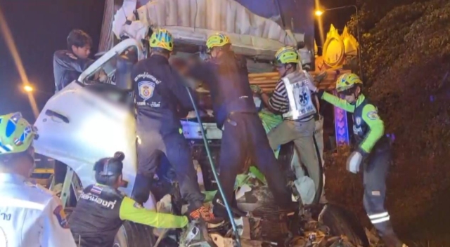 ส่วนผู้เสียชีวิตทั้ง 2 ราย ซึ่งถูกอัดก๊อปปี้ติดคาซากรถพ่วงบรรทุกปุ๋ย และรถสิบล้อขนสุกร หน่วยกู้ภัยฯ ต้องใช้เครื่องตัดถ่างงัดเพื่อนำร่างผู้เสียชีวิตออกจากซากรถ โดยใช้เวลานานกว่า 2 ชั่วโมง จึงสามารถนำร่างผู้เสียชีวิตออกมาได้ ก่อนจะเคลื่อนย้ายไปไว้ที่ รพ. เพื่อรอญาติมารับไปประกอบพิธีทางศาสนา