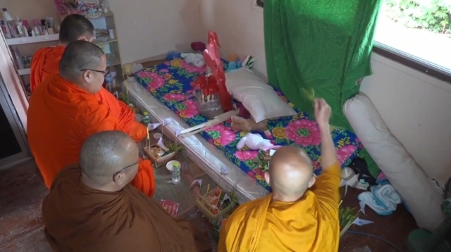 วันนี้ทางครอบครัวแม่น้องแพรว ได้นำอาหารพร้อมน้ำดื่มมาวางให้น้องแพรวได้กินที่บริเวณบ้านในสวนลำไย ตำบลน้ำแพร่ อำเภอหางดงจุดเกิดเหตุ ก่อนจะนิมนต์พระสงฆ์ 4 รูป มาประกอบพิธีสูตรถอนภายในห้องนอนของน้องแพรวตามความเชื่อ เพื่อเป็นการเชิญวิญญาณน้องกลับไปยังบ้านเกิด ที่อำเภอเวียงแหง