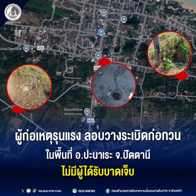 (3 เม.ย. 2569) เพจ กองอำนวยการรักษาความมั่นคงภายในภาค 4 ส่วนหน้า รายงานว่า เมื่อเวลาประมาณ 08.30 น. เกิดเหตุลอบวางระเบิดในพื้นที่ต.ปะนาเระ อ.ปะนาเระ จ.ปัตตานี รวม 3 จุด ได้แก่ บริเวณบ้านคลองต่ำ บริเวณวงเวียนหอนาฬิกา และบริเวณสามแยกก่อนถึงด่านตรวจของเจ้าหน้าที่ โดยลักษณะเป็นวัตถุระเบิดแสวงเครื่องแบบไม่มีสะเก็ด ซึ่งมีแรงระเบิดจำกัด เบื้องต้นไม่พบผู้ได้รับบาดเจ็บหรือความเสียหายรุนแรง