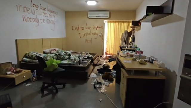 นอกจากนี้ สภาพภายในห้องพักพบข้าวของถูกรื้อค้นกระจัดกระจาย บริเวณโต๊ะอ่านหนังสือใกล้ประตูพบอาวุธมีดปลายแหลมเปื้อนเลือดวางอยู่ 1 เล่ม ที่น่าตกใจคือบริเวณฝาผนังห้องและผนังห้องน้ำ มีการใช้เลือดเขียนข้อความภาษาอังกฤษทิ้งไว้หลายประโยค ซึ่งแปลใจความได้ในทำนองว่า "ฉันต้องไป... ฉันพยายามอย่างหนักจริงๆ ความเข้าใจสำคัญกว่าเรื่องเงิน..." เจ้าหน้าที่จึงได้บันทึกภาพและรวบรวมไว้เป็นหลักฐาน