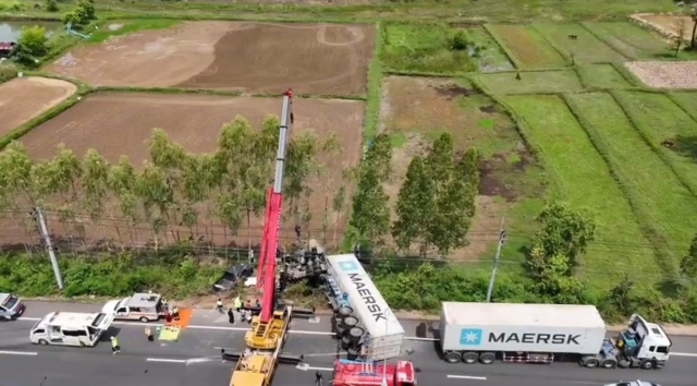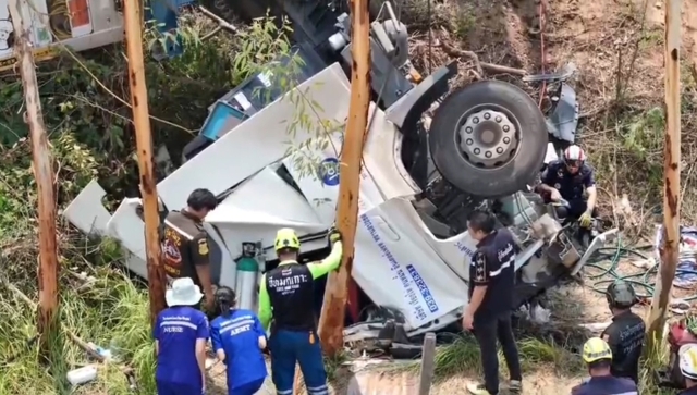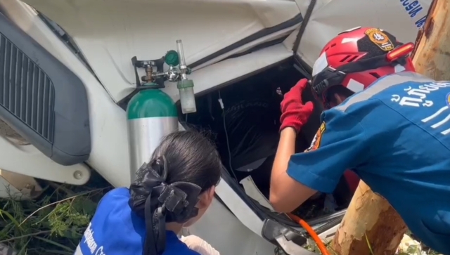 คนขับรถพ่วงชายวัย 50 ปี ถูกซากรถกดทับช่วงเอวถึงขา ไม่สามารถออกมาได้ เจ้าหน้าที่ต้องนำเครื่องช่วยหายใจและออกซิเจนเข้าประคองอาการตลอดเวลา