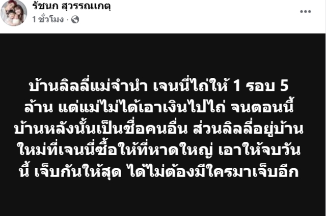 และเห็นว่าครั้งนี้แกไม่มีรถเลยให้กลับไปใช้อีกรอบ เพราะอยากให้แม่มีรถขับ แต่ที่ไม่โอนเป็นชื่อแม่เพราะกลัวเหตุการณ์เดิมๆจะเกิดขึ้น บ้านลิลลี่แม่จำนำ เจนนี่ไถ่ให้ 1 รอบ 5 ล้าน แต่แม่ไม่ได้เอาเงินไปไถ่ จนตอนนี้บ้านหลังนั้นเป็นชื่อคนอื่น ส่วนลิลลี่อยู่บ้านใหม่ที่เจนนี่ซื้อให้ที่หาดใหญ่ เอาให้จบวันนี้ เจ็บกันให้สุด ได้ไม่ต้องมีใครมาเจ็บอีก เงินเดือนเคยให้เดือนละ แสน แม่ขอเบิกล่วงหน้าตลอด ให้ทีเป็นล้าน หลังๆ ขอใหม่ ลดเหลือ 50,000 ล่าสุดลดเหลือ 20,000 แม่เป็นคนประชดเอง ว่าไม่เอาแล้ว เมื่อเดือนล่าสุด