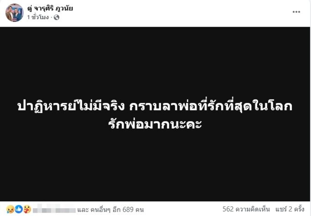 (16 ต.ค.2568) ตู่ จารุศิริ ภูวนัย ลูกสาว นาท ภูวนัย โพสต์เฟซบุ๊ก แจ้งข่าวเศร้า นาท ภูวนัย อดีตพระเอกชื่อดัง เสียชีวิตแล้ว ในวัย 79 ปี โดยระบุข้อความว่า "ปาฏิหาริย์ไม่มีจริง กราบลาพ่อที่รักที่สุดในโลก รักพ่อมากนะคะ" ก่อนจะโพสต์ภาพคุณพ่อเมื่อครั้งยังมีชีวิต พร้อมข้อความสุดเศร้าอีกว่า "ไม่มีอีกแล้ว พ่อที่รักที่สุด หนูรักพ่อมากๆนะคะ"