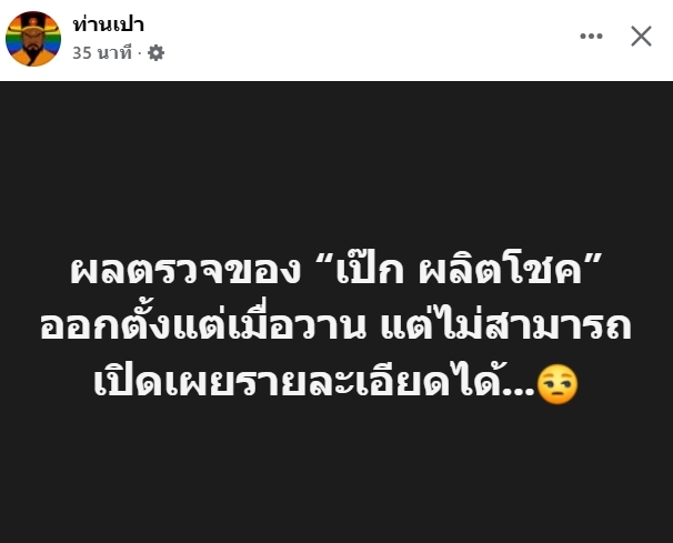 16ต.ค.68 ล่าสุด เพจท่านเปา โพสต์ข้อความโดยระบุว่า ผลตรวจของ “เป๊ก ผลิตโชค” ออกตั้งแต่เมื่อวาน แต่ไม่สามารถเปิดเผยรายละเอียดได้ งานนี้ทำเอาชาวเน็ตแห่คอมเม้นต์ อาทิ เปิดเผยไม่ได้ = มีผลLกฮแหล่ะ,ใส่ใจรอ,เปิดเผยไม่ได้แล้วจะตรวจเพื่อ!,ไม่คาดหวัง ไม่ผิดหวัง,ยิ่งทำแบบนี้ยิ่งเดาผลกันไปหลายทิศหลายทางไม่เปนผลดีเลยเด้อ,แล้วจะบอกเพื่ออะไรละ ในเมื่อเปิดเผยไม่ได้,ฯลฯ