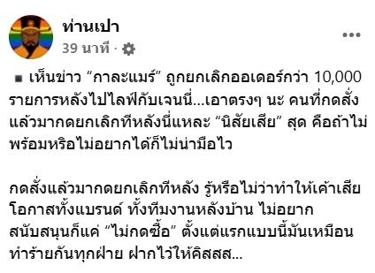 ด้านเพจท่านเปาโพสต์ข้อความระบุ เห็นข่าว “กาละแมร์” ถูกยกเลิกออเดอร์กว่า 10,000 รายการหลังไปไลฟ์กับเจนนี่…เอาตรงๆ นะ คนที่กดสั่งแล้วมากดยกเลิกทีหลังนี่แหละ “นิสัยเสีย” สุด คือถ้าไม่พร้อมหริอไม่อยากได้ก็ไม่น่ามือไวกดสั่งแล้วมากดยกเลิกทีหลัง รู้หรือไม่ว่าทำให้เค้าเสียโอกาสทั้งแบรนด์ ทั้งทีมงานหลังบ้าน ไม่อยากสนับสนุนก็แค่ “ไม่กดซื้อ” ตั้งแต่แรกแบบนี้มันเหมือนทำร้ายกันทุกฝ่าย ฝากไว้ให้คิสสส