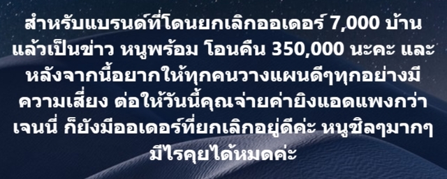 ล่าสุด รัชนก สุวรรณเกตุ หรือ เจนนี่ ได้หมดถ้าสดชื่น นักร้อง นักแสดง และยูทูบเบอร์หญิงชาวไทย ได้โพสต์ข้อความลงในเฟซบุ๊ก “รัชนก สุวรรณเกตุ” ถึงกรณีดังกล่าวว่า “สำหรับแบรนด์ที่โดนยกเลิกออเดอร์ 7,000 บ้านแล้วเป็นข่าว หนูพร้อม โอนคืน 350,000 นะคะ และหลังจากนี้อยากให้ทุกคนวางแผนดีๆ ทุกอย่างมีความเสี่ยง ต่อให้วันนี้คุณจ่ายค่ายิงแอดแพงกว่าเจนนี่ ก็ยังมีออเดอร์ที่ยกเลิกอยู่ดีค่ะ หนูชิลๆ มากๆ มีไรคุยได้หมดค่ะ”