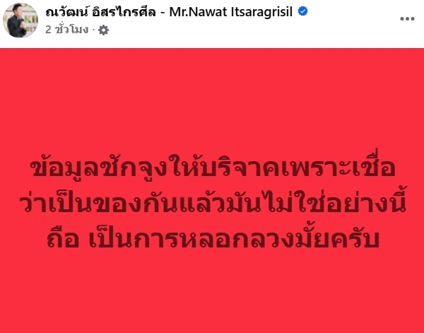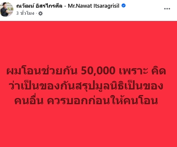 ล่าสุด ณวัฒน์ อิสรไกรศีล หรือ “บอสณวัฒน์” โพสต์ข้อความผ่านเฟซบุ๊ก โดยระบุข้อความว่า “ผมโอนช่วยกัน 50,000 เพราะคิดว่าเป็นของกันสรุปมูลนิธิเป็นของคนอื่น ควรบอกก่อนให้คนโอน”
