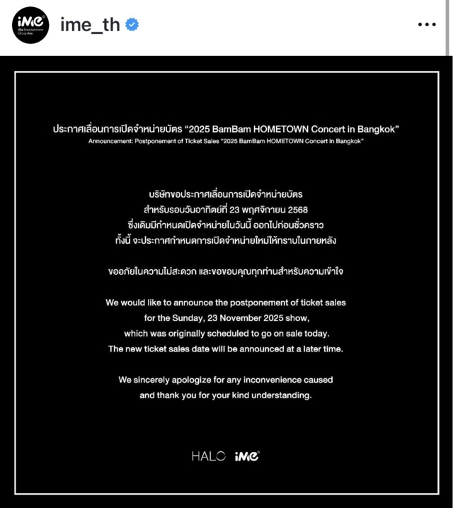 วันที่ 25 ตุลาคม 68 ผู้สื่อข่าวรายงานว่า ผู้จัดคอนเสิร์ต แบมแบม ได้โพสต์ข้อความลงใน อินสตาแกรม “iMeThailand” แจ้งว่า ประกาศเลื่อนการเปิดจำหน่ายบัตร “2025 BamBam HOMETOWN Concert in Bangkok”