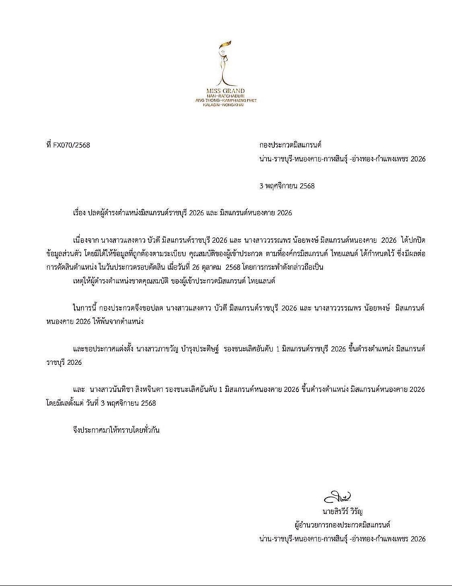 วันที่ 3 พ.ย. 68 นาย สิรวีร์ วิรัญ ผู้อำนวยการกองประกวดมิสแกรนด์น่าน-ราชบุรี-หนองคาย-กาฬสินธุ์-อ่างทอง-กำแพงเพชร 2026 ได้ลงนามในเอกสาร เรื่อง ปลดผู้ดำรงตำแหน่งมิสแกรนด์ราชบุรี 2026 และ มิสแกรนด์หนองคาย 2026