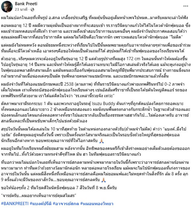 "ผมอยู่ในทีมโรงเรียนจนถึง ม.3 หลังจากนั้น อิทธิพลของดนตรีก็เข้าสิงร่างผมอย่างเต็มตัวเลยต้องขอออกจากทีมไป...ทิ้งไว้ด้วยความทรงจำดีๆที่โหด มัน ฮา ในทีมฟุตบอลราชวินิตบางแก้ว ที่บอกว่าผมไม่แปลกใจเลยที่เห็นอาจารย์สกลตามหน้าเพจมากมายในวันนี้ก็เพราะว่าอาจารย์สกลผ่านร้อนผ่านหนาวมามาก ทำทีมคว้าถ้วยรางวัลมานักต่อนัก หลายต่อหลายโรงเรียน"