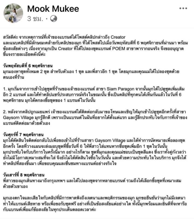 ต่อมา “หมอมุกกินเค้ก” ได้ชี้แจงถึงกรณีดังกล่าว โดยยืนยันว่าไปลองชุดจริงยอมรับว่าตกใจและเสียใจกับคลิปที่มีการพาดพิงถึงเจตนาและพฤติกรรมของมุก มุกขอยืนยันว่ามุกไม่มีเจตนาทำให้แบรนด์เสียหาย หรือเพื่อขอรับชุดฟรี อย่างที่เป็นข้อสงสัยแต่อย่างใด ทั้งนี้ มุกพร้อมและยินดีที่จะหารือกับแบรนด์เพื่อแก้ข้อสงสัยในทุกประเด็นตลอดเวลาค่ะ