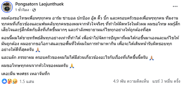 "ตอนนี้ผมได้ขายทรัพย์สินทุกอย่างเท่าที่ทำได้ เพื่อนำไปจัดการปัญหาที่ผมได้ก่อขึ้นมาเองและแก้ไขให้มันถูกต้อง ผมอยากขอโอกาสและขอพื้นที่ให้ผมในการทำมาหากิน เพื่อจะได้เดินหน้ารับผิดชอบทุกอย่างให้ดีที่สุดครับ และแต๊ก ภรรยาผม ครอบครัวของผมไม่ได้มีส่วนเกี่ยวข้องอะไรกับเรื่องที่เกิดขึ้นนี้ครับ ผมขอโทษทุกคนจากหัวใจของผมครับ เดอะมีน พงศธร เหลาจันทึก"