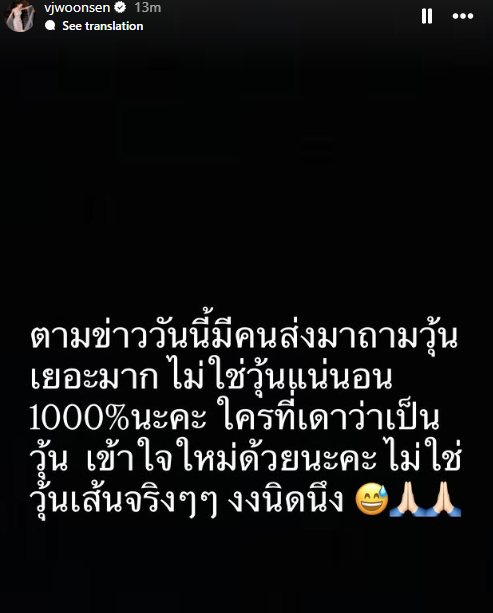 ต่อมา "วุ้นเส้น วิริฒิพา" หนึ่งในดาราสาวที่ถูกโยงถึง หลังจากเพจ ท่านเปา เผยคำใบ้ดังกล่าว ได้ออกมาโพสต์ไอจีสตอรี่ "ตามข่าววันนี้มีคนส่งมาถามวุ้นเยอะมาก ไม่ใช่วุ้นแน่นอน1000%นะคะ ใครที่เดาว่าเป็นวุ้นเข้าใจใหม่ด้วยนะคะไม่ใช่วุ้นเส้นจริงๆๆงงนิดนึง ถ้ามีเพจไหนเอาข่าววุ้นไปลงข่าวที่ไม่เป็นความจริง ขอดำเนินตามกฎหมายนะคะ"