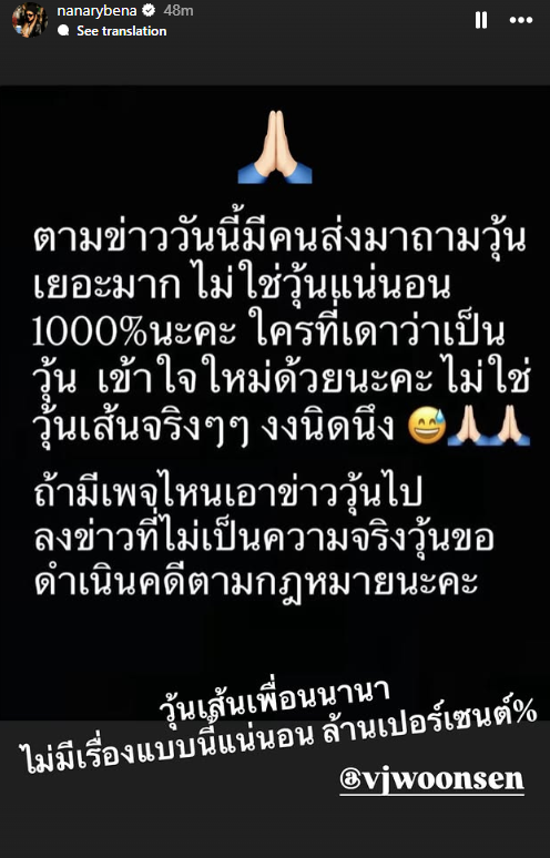 แต่ยังไม่จบลงเท่านี้ เพราะหลายคนได้มีการโยงไปยัง "นานา ไรบีนา" หลังจากที่เพจดังออกมาเผยตัวอักษรย่อ น. ล่าสุด "นานา ไรบีนา" ได้แชร์ไอจีสตอรี่ของ "วุ้นเส้น วิริฒิพา" พร้อมระบุข้อความว่า "วุ้นเส้นเพื่อนนานา ไม่มีเรื่องแบบนี้แน่นอน ล้านเปอร์เซนต์"