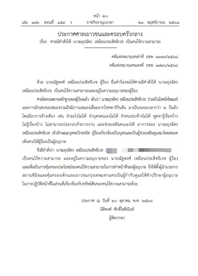จึงมีคำสั่งให้นางมยุรฉัตร เป็นคนไร้ความสามารถ อยู่ในความอนุบาลของ นายณัฐพงศ์ เหมือนประสิทธิเวช ผู้ร้อง และเพื่อเป็นการคุ้มครองผลประโยชน์ของคนไร้ความสามารถในการทำหน้าที่ของผู้อนุบาล จึงให้ตั้งผู้อำนวยการสถานพินิจและคุ้มครองเด็กและเยาวชนกรุงเทพมหานคร เป็นผู้กำกับดูแลให้คำปรึกษาผู้อนุบาล ในการปฏิบัติหน้าที่ในส่วนที่เกี่ยวกับทรัพย์สินของคนไร้ความสามารถ ลงประกาศวันที่ 20 ต.ค. 68