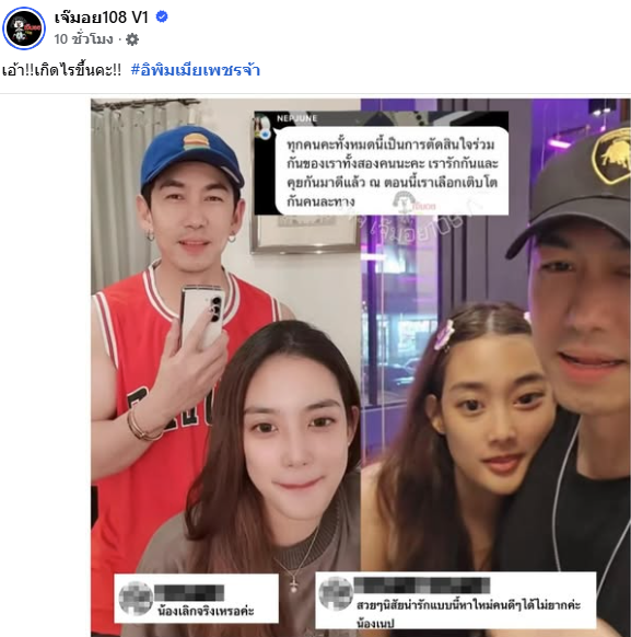 เกิดอะไรขึ้น ล่าสุด เพจเจ๊มอย ได้โพสต์ภาพของคู่รักต่างวัย "ดีเจเพชรจ้า วิเชียร" และ "น้องเนปจูน" พร้อมแชทข้อความในกลุ่มแฟนคลับที่ทั้งคู่ได้มีการประกาศเกี่ยวกับสถานะในตอนนี้ ได้ตัดสินใจจบความสัมพันธ์แล้ว