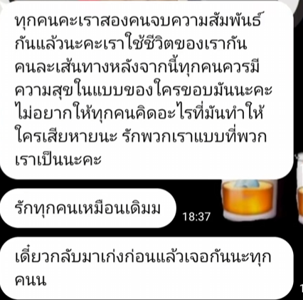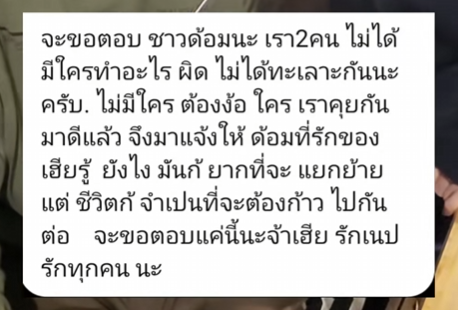"ทั้งหมดนี้เป็นการตัดสินใจร่วมกันของเราทั้งสองคนนะคะ เรารักกันและคุยกับมาดีแล้ว ณ ตอนนี้เลือกเติบโตกันคนละทาง"