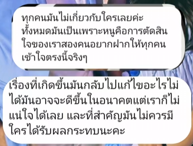"มันไม่เกี่ยวกับใครเลยค่ะทั้งหมดมันเป็นเพราะหนูคือการตัดสินใจของเราสองคน อยากฝากให้ทุกคนเข้าใจตรงนี้จริงๆ"