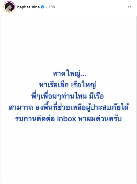 คนในวงการบันเทิงต่างออกมาเคลื่อนไหวช่วยกระจายข่าว รวมถึง "นาย ณภัทร" พระเอกดัง ก่อนหน้านี้ออกมแชร์โพสต์ไอจีสตอรี่ เพื่อเป็นกระบอกเสียงให้กับผู้ประสบภัยในพื้นที่ที่ยังคงติดอยู่ในอาคาร ทั้งยังโพสต์ข้อความช่วยตามหาเรือว่า "หาดใหญ่ หาเรือเล็ก เรือใหญ่ พี่ๆ เพื่อนๆ ท่านไหนมีเรือ สามารลงพื้นที่ช่วยเหลือผู้ประสบภัยได้ รบกวนอินบ็อก หาผมด่วนครับ"