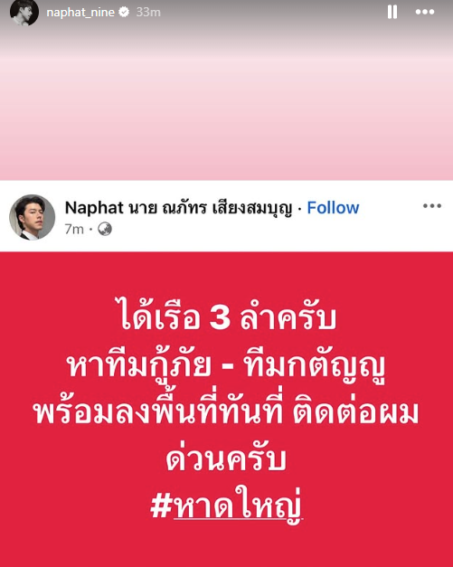 ล่าสุด นาย ณภัทร ได้อัปเดตเพิ่มเติมว่า "กำลังเดินทางไปหนึ่งทีมครับ ขอบคุณพี่ๆทีม ดับเพลิง มูลนิธิร่วมกตัญญูจังหวัดเชียงใหม่ #หาดใหญ่ สามารถพิมพ์รายละเอียดขอความช่วยเหลือในโพสต์นี้ได้เลยครับ"