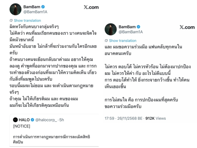 ต่อมา "แบมแบม" ได้แชร์แถลงการณ์ดังกล่าวผ่านแพลตฟอร์ม X พร้อมโพสต์ต่ออีกว่า "ผิดหวังกับคนบางกลุ่มจริงๆ ไม่คิดว่า คนที่ผมเรียกคนของเรา บางคนจะจิตใจมืดมัวขนาดนี้ มันน่าอับอาย ไม่กล้าที่จะร่วมงานกับใครอีกเลยครับ ถ้าคนบางคนจะย้อนกลับมาด่าผม อยากให้คุณลองดู คำพูดที่ออกมาจากปากของคุณ และ การกระทำของตัวเองก่อนที่จะมาให้ความคิดเห็น เกี่ยวกับสิ่งที่ผมพูดไปนะครับ รอบนี้ผมจะไม่ยอม และ จะดำเนินตามกฎหมายจริงๆ ถ้าคุณ ไม่ให้เกียรติผม และ คนของผม ผมก็จะไม่ให้เกียรติคุณเหมือนกัน"