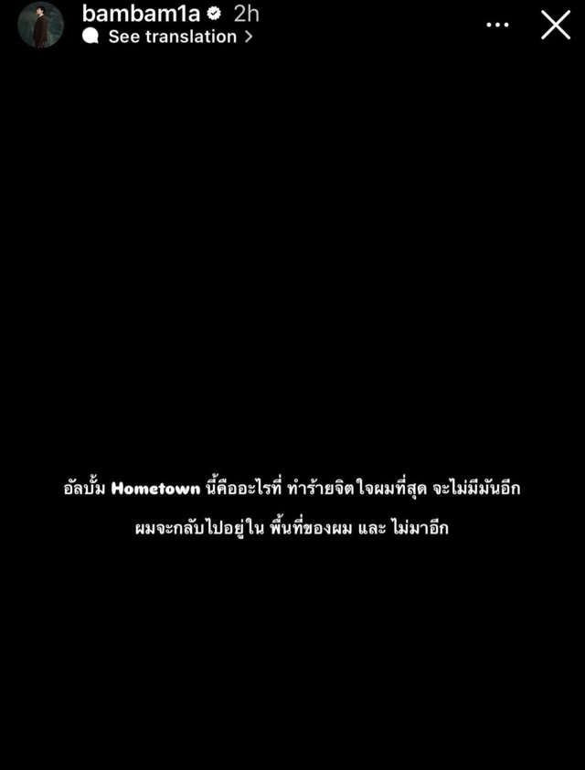 ทั้งนี้ แบมแบม ยังโพสต์ไอจีสตอรี่เป็นพื้นหลังสีดำ ระบุข้อความว่า "อัลบั้ม Hometown นี้คืออะไรที่ ทำร้ายจิตใจผมที่สุด จะไม่มีมันอีกผมจะกลับไปอยู่ใน พื้นที่ของผม และ ไม่มาอีก"