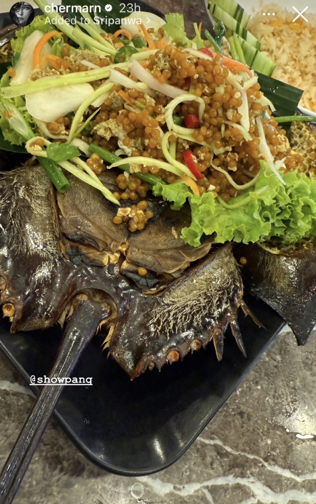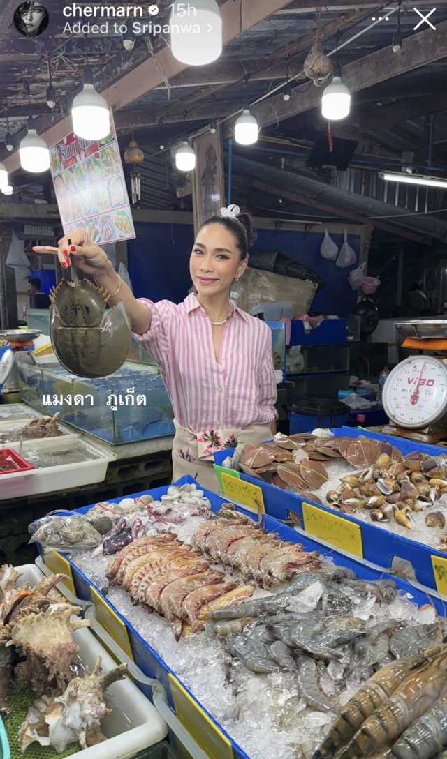 แต่ที่ทำเอาผู้ติดตามสะดุ้งยิ่งกว่า หลังมัมพลอย โพสต์ไอจีสตอรี่ขณะยืนถือแมงดาทะเลโชว์ พร้อมยิ้มหวานๆ ให้กับกล้อง ทั้งยังมีแคปชั่นน้อยๆ ระบุไว้ว่า "แมงดา ภูเก็ต" ก่อนจะตามมาด้วยรูปชวนน้ำลายสอกับเมนูยำไข่แมงดาทะเล