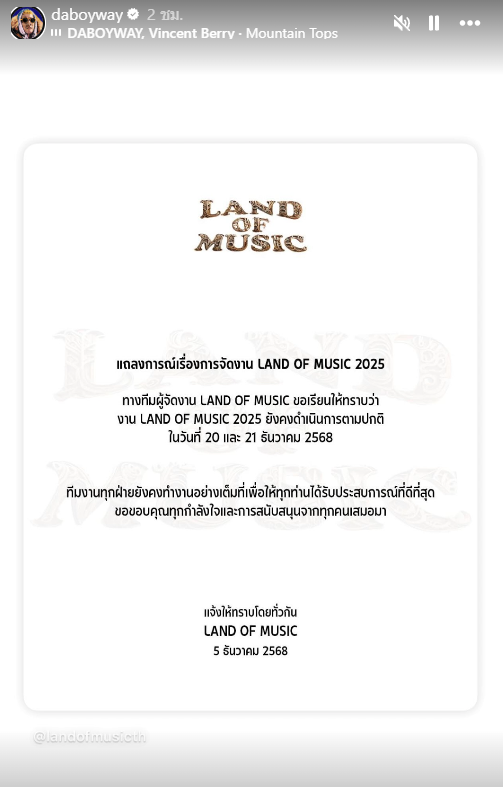 landofmusicth เผยว่า "แถลงการณ์เรื่องการจัดงาน Land of music 2025 ทางทีมผู้จัดงาน Land of Music ขอเรียนให้ทราบว่า งาน Land of Music 2025 ยังคงดำเนินการตามปกติในวันที่ 20 และ 21 ธันวาคม 2568 ทีมงานทุกฝ่ายยังคงทำงานอย่างเต็มที่เพื่อให้ทุกท่านได้รับประสบการณ์ที่ดีที่สุด ขอขอบคุณทุกกำลังใจและการสนับสนุนจากทุกคนเสมอมา แจ้งให้ทราบโดยทั่วกัน LAND OF MUSIC 5 ธันวาคม 2568