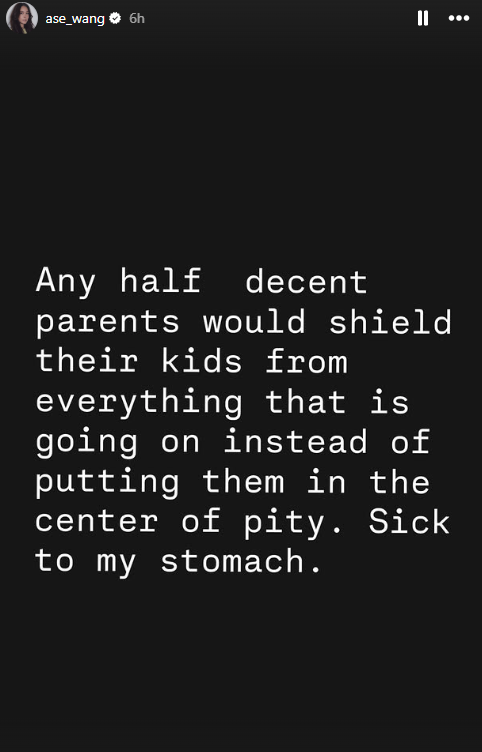 "ครอบครัวของผู้ที่เสียหายก็มีโมเมนต์มากมายทั้งทุกข์ทั้งเศร้าทั้งเสียใจ ทั้งหมดหนทางแบบนั้นกับครอบครัวเช่นกันแต่ไม่เคยเอาลงโพสต์เรียกคะแนนสงสารใดใดไม่ลากเด็กลงมาปนเปื้อนกับสิ่งเหล่านี้เรื่องยังไม่ทันจะจบมันเพิ่งเริ่มต้นหยุดพฤติกรรมแบบนี้เถอะค่ะ หยุดลากเด็กเข้ามาเพื่อให้คนได้มีอารมณ์ร่วม กับคุณเลย เหยื่อรายอื่นๆเค้าก็มีลูกมีเต้ามีครอบครัวที่น่าเห็นใจเช่นกันแต่เค้าไม่ทำพฤติกรรมแบบคุณ หรือนี่มันเป็นแค่เกมสำหรับคุณ"