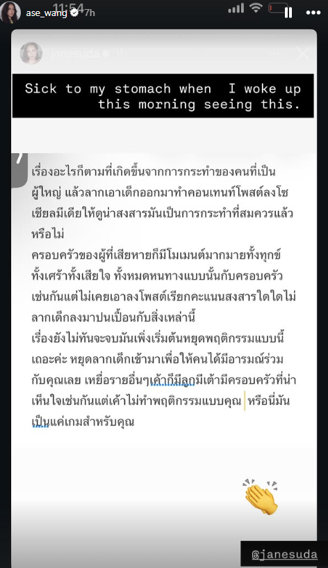 ท่ามกลางข่าวใหญ่สะเทือนวงการบันเทิง เมื่อ "เจนสุดา ปานโต" เคลื่อนไหวเป็นครั้งแรกผ่านไอจีสตอรี่ ระบุข้อความว่า "เรื่องอะไรก็ตามที่เกิดขึ้นจากการกระทำของคนที่เป็น ผู้ใหญ่ แล้วลากเอาเด็กออกมาทำคอนเทนต์โพสต์ลงโซเชียลมีเดียให้ดูน่าสงสารมันเป็นการกระทำที่สมควรแล้วหรือไม่"
