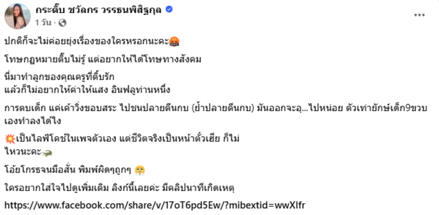 ทั้งยังโพสต์อีกข้อความว่า "บางทีสิ่งที่น่ากลัวกว่า ผู้ใหญ่ที่ลงมือทำร้ายเด็ก คือ ผู้ใหญ่ที่ยังคิดว่าตัวเองมีสิทธิ์ทำได้ ในประเทศนี้ เด็กแค่เดินเฉียดตีนกบ แต่ถูกตบเหมือนเป็นอาชญากร ขณะที่ผู้ใหญ่กลับอธิบายตัวเองยาวเหยียด เหมือนกำลังเขียนเรียงความแก้เกรด ไม่ใช่รับผิดชอบชีวิตคนตัวเล็กๆ คำว่า ผมแค่สอนบทเรียน มันน่ากลัวกว่าแรงตบอีก เพราะหมายถึงว่า…ผู้ชายร่างใหญ่คนหนึ่ง เชื่อจริงๆ ว่าตัวเอง เหนือเด็ก และ เหนือกฎหมาย นี่คือปัญหาของสังคมไทย ไม่ใช่แค่เหตุการณ์เดี่ยว เราถูกสอนให้เคารพผู้ใหญ่ แต่ผู้ใหญ่บางคนไม่เคารพความเป็นมนุษย์ของเด็กเลย เด็กมีแค่ร่างกายเล็กๆ กับเสียงเบาๆ แต่กลับต้องรับมือกับอารมณ์ของผู้ใหญ่ที่ตัวใหญ่กว่าเป็นสิบเท่ ความจริงง่ายที่สุด คือ เด็กไม่ใช่ที่ระบายอารมณ์ของผู้ใหญ่ และการตีเด็ก ไม่ว่าจะด้วยเหตุผลอะไร มันคือ ความรุนแรง ไม่ใช่ บทเรียน สังคมที่ยอมให้ผู้ใหญ่ทำร้ายเด็กได้ จะไม่มีวันเป็นสังคมที่ปลอดภัยสำหรับใครทั้งนั้น ถ้าผู้ใหญ่ยังไม่โต เด็กในประเทศนี้จะเติบโตอย่างไร?"