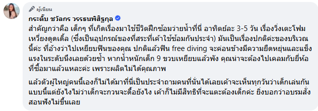 ทั้งยังคอมเมนต์ข้อความเพิ่มเติมอีกว่า "สำคัญกว่าคือ เด็กๆ ที่เกิดเรื่องมาใช้ชีวิตฝึกซ้อมว่ายน้ำที่นี่ อาทิตย์ละ 3-5 วัน เรื่องวิ่งเตะโฟม เหวี่ยงดูดเดิ้ล (ซึ่งเป็นอุปกรณ์ของที่สระที่เค้าใช้ซ้อมกันประจำ) มันเป็นเรื่องปกติค่ะของบริเวณนี้ค่ะ ที่อ้างว่าไปเหยียบฟินของคุณ ปกติแล้วฟิน free diving จะค่อนข้างมีความยืดหยุ่นและแข็งแรงในระดับนึงเลยด้วยซ้ำ หากน้ำหนักเด็ก 9 ขวบเหยียบแล้วพัง คุณน่าจะต้องไปเคลมกับยี่ห้อที่ซื้อมาแล้วแหละค่ะ เพราะผลิตไม่ได้คุณภาพ แล้วตัวผู้ใหญ่คนนี้เองก็ไม่ได้มาที่นี่เป็นประจำถามคนที่นั่นได้เลยเค้าจะเห็นทุกวันว่าเด็กเล่นกันแบบนี้แต่ยังไงไม่ว่าเด็กจะกวนจะดื้อยังไง เค้าก็ไม่มีสิทธิที่จะแตะต้องเด็กค่ะ ยิ่งบอกว่าอบรมสั่งสอนฟังไม่ขึ้นเลย"