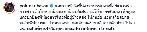 ขณะที่ฝั่งของคนบันเทิงที่ออกมาเคลื่อนไหวเรื่องนี้ ไม่ว่าจะเป็น แทค ภรัณยู, อาร์ต พศุตม์ และ บุ๋ม ปนัดดา รวมถึงล่าสุด "ป๋อ ณัฐวุฒิ" โพสต์ภาพตัวเองในชุดทหาร พร้อมแคปชั่นระบุว่า "ขอกราบหัวใจพี่น้องทหารทุกคนที่อยู่แนวหน้า การทำหน้าที่ทหารต้องแลก ต้องเสียสละ แม้ชีวิตของตัวเอง เพื่อดูแลและปกป้องพี่น้องชาวไทยที่อยู่ข้างหลัง ให้กินอิ่ม นอนหลับสบาย ขอให้พี่น้องทหารไทยทุกคนปลอดภัย และ พาตัวเองกลับบ้าน ไปหาครอบครัวที่ท่านรักได้ทุกนายนะครับ ผมรักทหารไทยครับ"