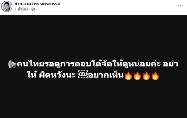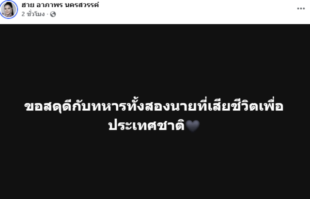 ทั้งยังโพสต์ต่อรัวๆ อีกว่า "คนไทยรอดูการตอบโต้จัดให้ดูหน่อยค่ะ อย่าให้ ผิดหวังนะ อยากเห็น" และ "ขอสดุดีกับทหารทั้งสองนายที่เสียชีวิตเพื่อประเทศชาติ" รวมถึง "ขอส่งกำลังใจให้กับทหารและประชาชนที่อยู่แนวชายแดน กันหน่อยค่ะพวกเรา"