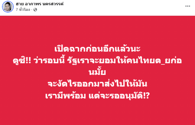 ขณะที่ฝั่งของคนบันเทิงต่างออกมาเคลื่อนไหวเรื่องนี้ ไม่ว่าจะเป็น แทค ภรัณยู, อาร์ต พศุตม์ และ บุ๋ม ปนัดดา รวมถึง "ฮาย อาภาพร" โพสต์ระบุว่า "เปิดฉากก่อนอีกแล้วนะ ดูซิ!! ว่ารอบนี้ รัฐเราจะยอมให้คนไทยต_ยก่อนมั้ย จะงัดไรออกมาส่งไปให้มัน เรามีพร้อม แต่จะรออนุมัติ!?"