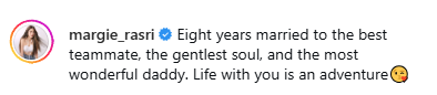 โดย "มาร์กี้ ราศรี" ได้โพสต์โมเมนต์ภาพคู่ พร้อมระบุแคปชั่นว่า "8 ปีในการแต่งงาน สู่การเป็นเพื่อนร่วมทีมที่ดีที่สุด จิตใจอ่อนโยนที่สุด และเป็นคุณพ่อที่วิเศษที่สุด ชีวิตที่มีกับคุณคือการผจญภัย"